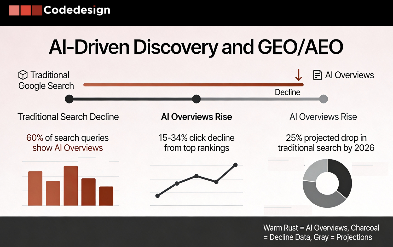 The data is unsparing. Google's own research shows that traditional rankings in the top position are seeing 15-34% fewer clicks as users get their answers from the AI overview instead. Gartner projects that traditional search will drop 25% by 2026. In other words, the old game—chasing volume keywords to drive traffic—is ending.