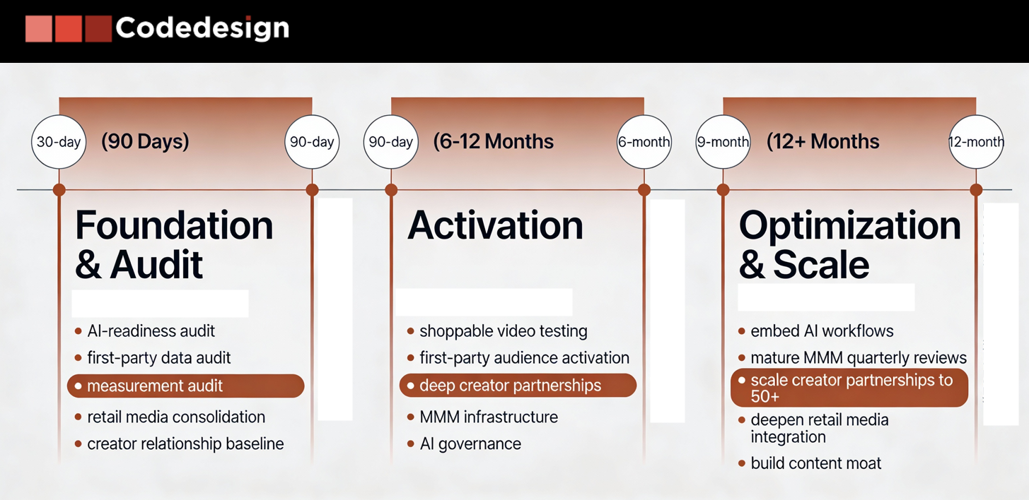 Accelerate: Build MMM infrastructure. Implement tools (open-source options like Meta's Robyn, or commercial platforms like Measured, Analytic Partners). Align your media team with finance. Report performance in business terms (incremental revenue, ROAS) instead of vanity metrics. Use MMM outputs to inform budget reallocation.