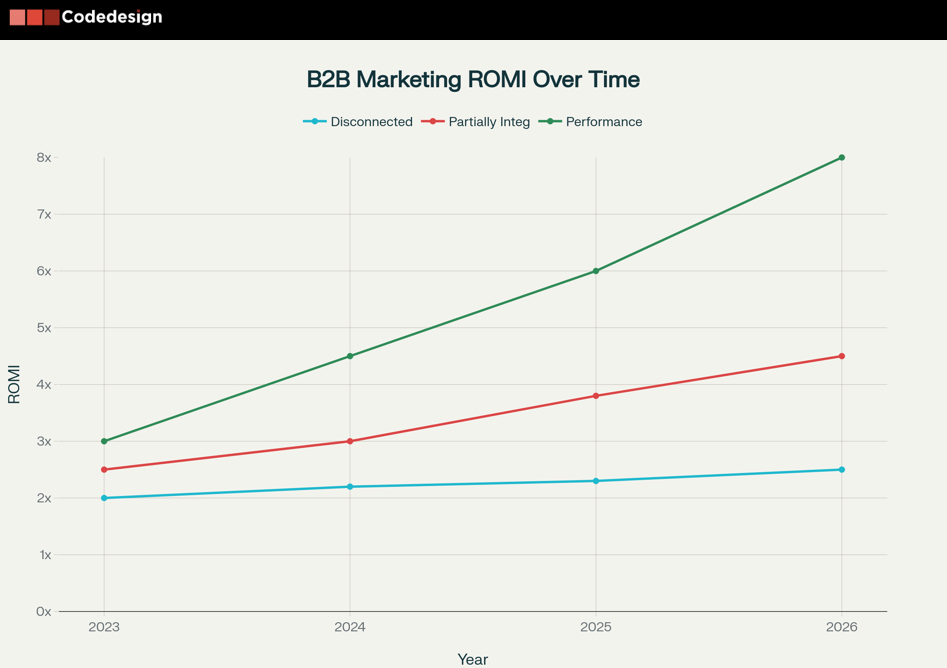 Insight: The 2026 Performance Stack dramatically outpaces legacy point solutions. Integrated stack users see ROMI grow from 3x (2023) to 8x (2026), while disconnected solutions stagnate near 2.5x.