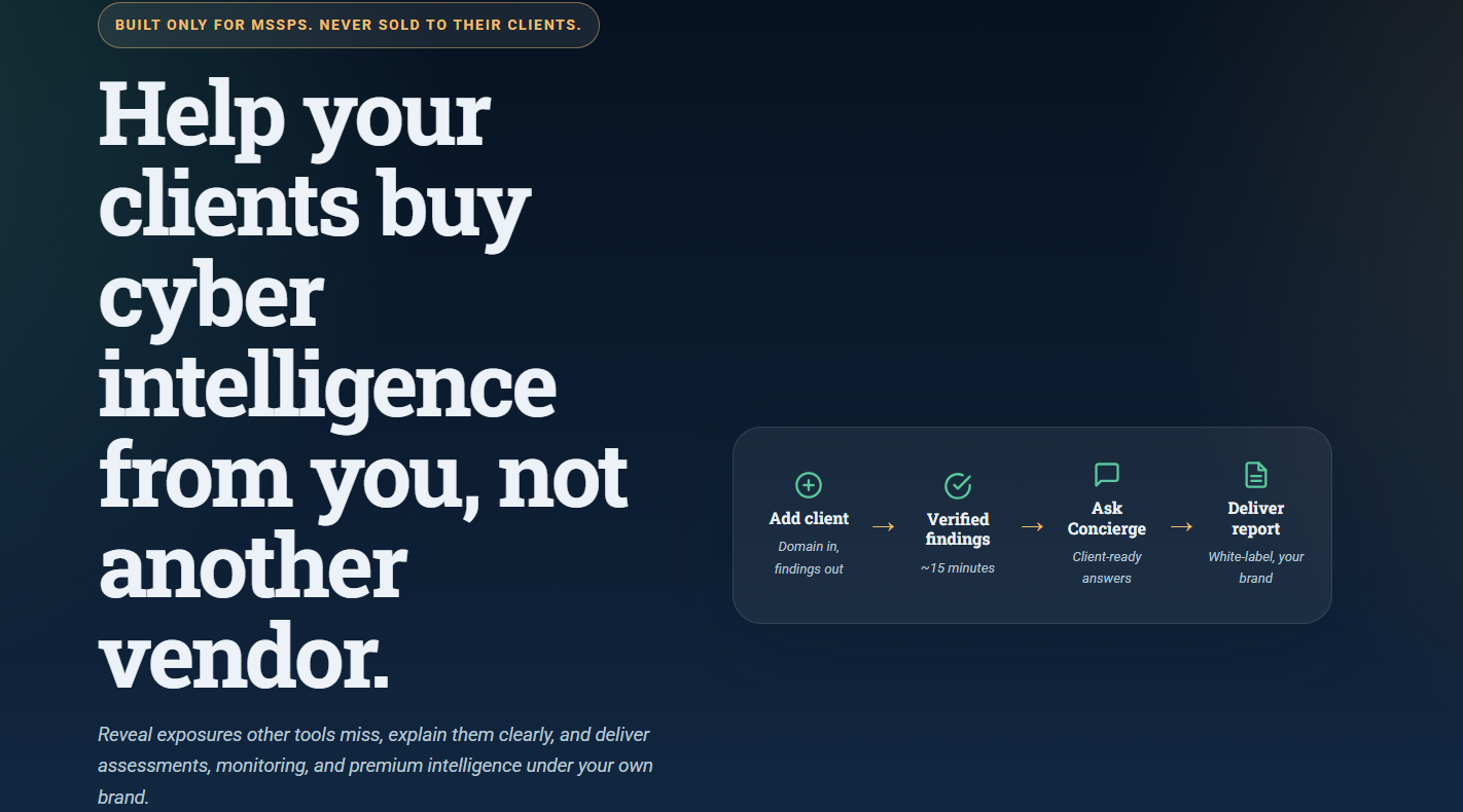Cyber Intelligence House is a premier cybersecurity intelligence platform designed exclusively for Managed Security Service Providers (MSSPs) and security professionals. The company operates on a unique business model: providing white-label cyber intelligence solutions that allow service providers to deliver sophisticated security assessments, continuous exposure monitoring, and premium threat intelligence under their own brand.