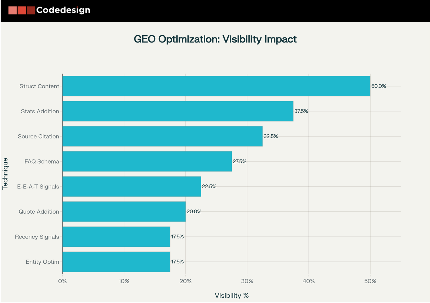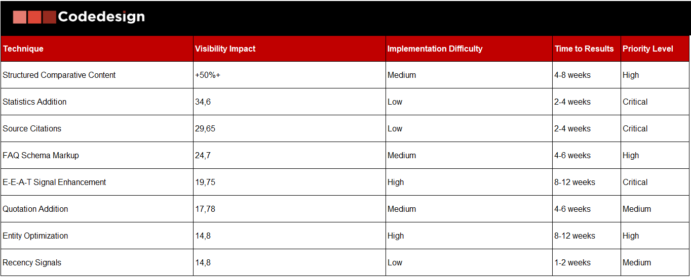 Empirical research demonstrates that structured comparative content delivers the highest visibility impact at 50%+, followed by statistics addition and source citations, providing clear priorities for GEO implementationStructured comparative content represents the highest-impact technique, potentially increasing visibility by 50% or more for competitive queries. AI systems frequently encounter queries requiring product, service, or approach comparison.
