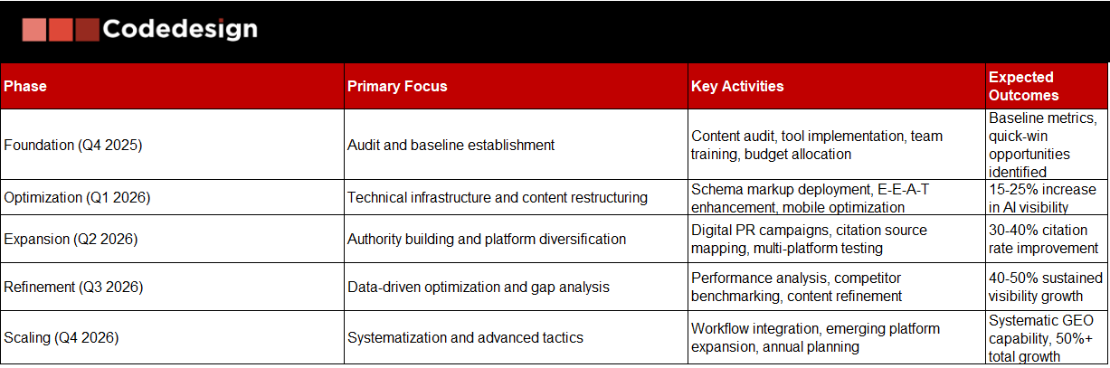 Scaling Phase (Q4 2026) systematizes GEO best practices into organizational workflows and expands to emerging platforms. Documentation of successful techniques, implementation checklists, and quality standards enables consistent optimization across expanding content volumes. Exploration of voice search optimization, multimodal content formats, and emerging AI platforms maintains competitive positioning as the landscape evolves. Annual strategic review and 2027 planning incorporate lessons learned while adapting to inevitable platform changes. Organizations reaching this phase typically achieve 50%+ total citation rate improvements relative to pre-GEO baselines while establishing systematic capabilities resistant to personnel turnover.