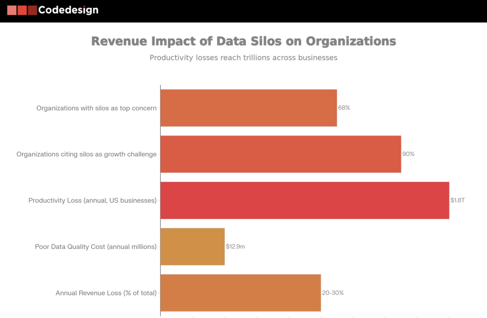 The numbers expose the true cost of gatekeeping. According to IDC Market Research, companies lose 20-30% of their revenue annually due to data silos. For a mid-sized business with $10 million in revenue, that represents $2-3 million in lost value every year. The sources of this loss are multifaceted: