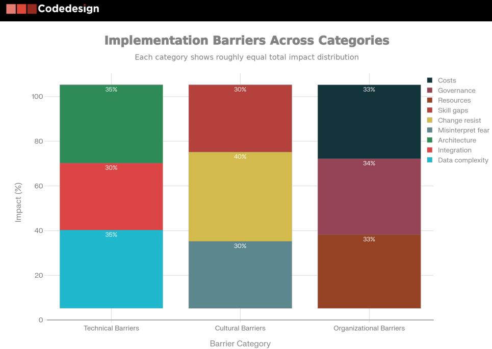 Understanding these barriers as isolated challenges misses their interconnection. Technical complexity creates culture problems—if systems are hard to use, adoption slows, and business value fails to materialize. Governance concerns drive technical complexity—adding security controls and audit capabilities increases system overhead. Resource constraints limit ability to address cultural concerns.