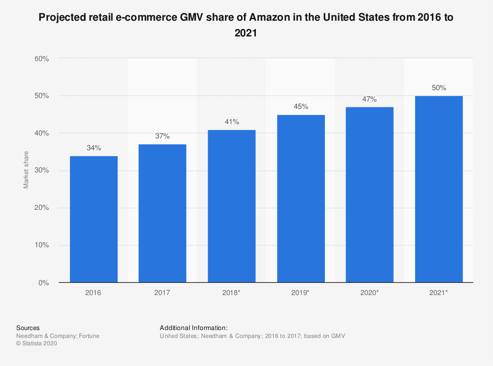 Amazon is undoubtedly the largest eCommerce retailer in the world. Its market share in the United States has increased from 34% in 2016 to 50% in 2021. That’s a huge difference!