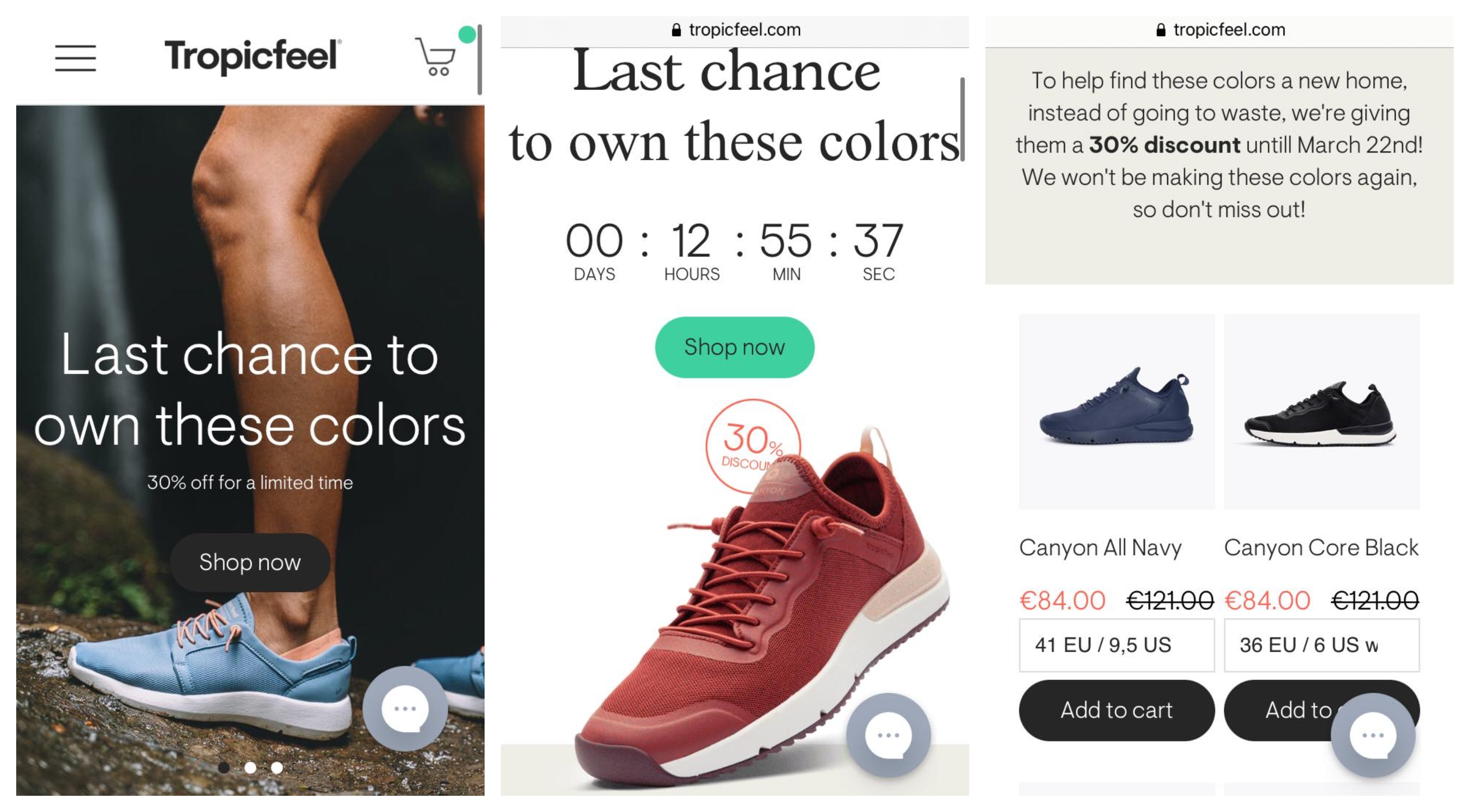 Talk about a sense of urgency. And to make the matter feel even more urgent, they’ve named the URL last-chance and put up a clock so you can see how much time you have left to get your never-again-seen shoes.